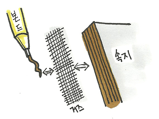 속지의 거즈에 본드를 바른 면을 표지와 접착한 후, 표지와 속지 한 쪽면에 고정용 꽃무늬 종이를 붙입니다.