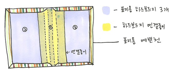 하드보드지를 속지보다 살짝 크게 앞뒤 면으로 자르고, 속지의 두께만큼 중간에 들어갈 하드보드지도 만들어 둡니다. 그리고 이 하드보드지 세 조각을 종이로 연결해서 붙여줍니다. 그래야 표지가 뒤틀리거나 찢어지지 않고 단단해 지거든요. 천을 덧씌우긴 하지만 그것만으로는 불안하니까요.