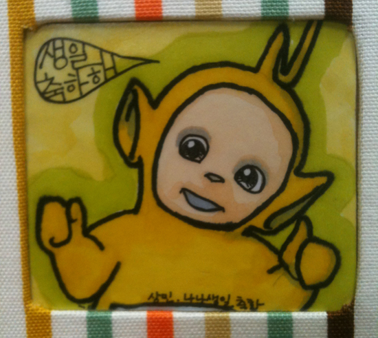 친구의 별명이 텔레토비의 '나나'이기 때문에 비슷하게 캐릭터를 그려넣습니다. 자, 캐릭터 확대사진입니다. 생일 축하 메세지까지 넣으면 친구가 더 감동하겠죠?
