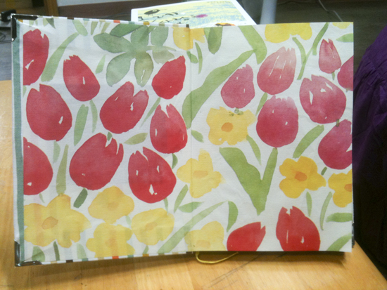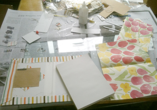 지금까지 한 과정을 마무리한 사진입니다. 옆에 있는 예쁜 꽃무늬 종이는 뭐냐구요? 우리에게 남은 마지막 과정입니다. 바로 속지와 표지를 연결해서 고정해줄 종이입니다.