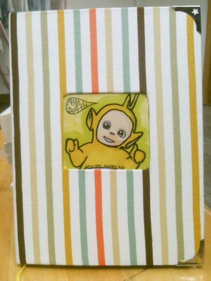 아! 한 가지가 빠졌네요. 친구의 닉네임 캐릭터를 넣을 공간을 마련해야죠. 앞 표지의 중간 부분을 적당한 크기로 잘라낸 후 천을 뒤쪽으로 빼서 접착해주면 됩니다. 그런 다음 캐릭터를 그려넣은 종이를 붙이는거죠.