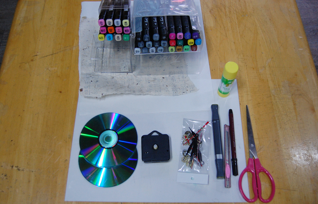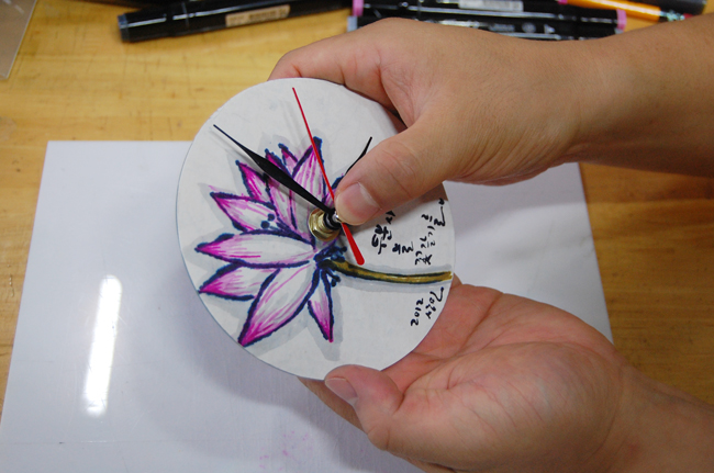 먼저 준비물입니다. 시계 부속은 인터넷으로 주문합니다. 시계 바늘 등도 다양하고 고를 수 있고요. 제가 구매한 것들의 가격은 2천 원 안쪽입니다. 시계판으로는 시디를 재활용합니다. 그림은 마카로 그리고, 그 외 한지, 칼, 풀, 가위 등의 문구류를 준비하면 됩니다.