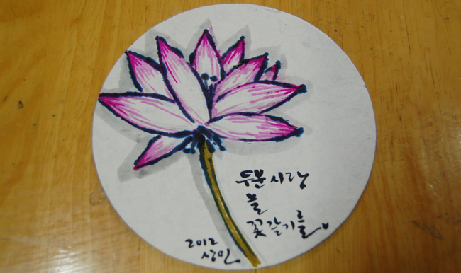 보고 그리기가 잘 안되서 제 마음 가는 대로 그렸더니 연꽃이라기보다는 연꽃을 닮은 새로운 종이 탄생했네요.^^ 두 분의 뜨거운 사랑을 기원하는 마음을 담아 달달한 멘트도 쓰고 서명도 합니다.