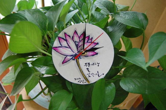 짠! 꽃시계 선물이 완성되었습니다. 연꽃의 분위기를 살리기 위해 초록색의 화분 위에 데코를 해보았습니다. 나름 운치가 있네요.