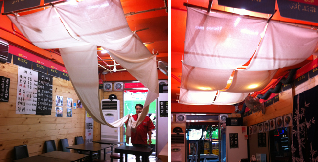 가게 살림이 넉넉지 않아 가을 개편에 허락된 돈은 단 돈 15만원! 최소한의 재료비로 최대한의 효과를 내야하는 미션입니다! 이단 헌트 요원이 된 기분으로 머리를 최대한 굴려봅니다. 일단 천정부터! 천정은 형광등과 백열조명이 섞인 직접 광인데다 대나무와 사케팩, 온갖 전선들이 엉켜 매우 지저분하고 정신없는 상황입니다. 제 진단은 어설프게 손댔다가는 공사가 크다, 일단 안보이게 가려버리자 입니다.
