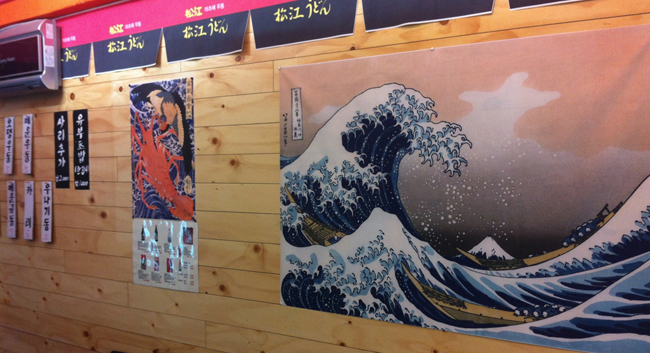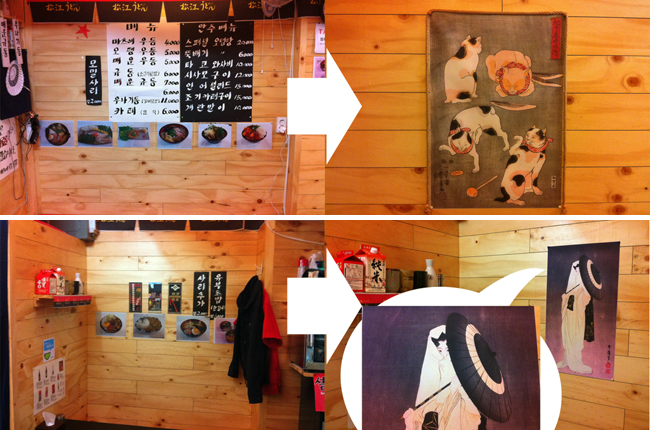 벽에 산만하게 나열되어 있었던 온갖 메뉴들과 사진들은 싹 정리해버렸습니다. 메뉴는 모든 자리에서 잘 보이는 곳에 하나로 통일하고 벽은 깔끔한 일본풍 그림만 걸어놓으려고 합니다. 인터넷에서 일본고전회화 그림파일을 다운받아 며칠에 걸쳐 여러 번 살펴봤습니다. 너무 일본색이 강하면 손님들에게 거부감이 들 수 있으니 사무라이 같은 것은 빼고 그저 슬쩍 일본 느낌만 나는 것으로, 수천 장 중에서 맘에 드는 예쁘고 무난한 그림을 찾기가 쉽지 않더라고요. 어쨌든 4점을 낙점, 적당한 크기로 천에 실사출력을 했습니다. 출력 가격은 2만원!