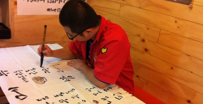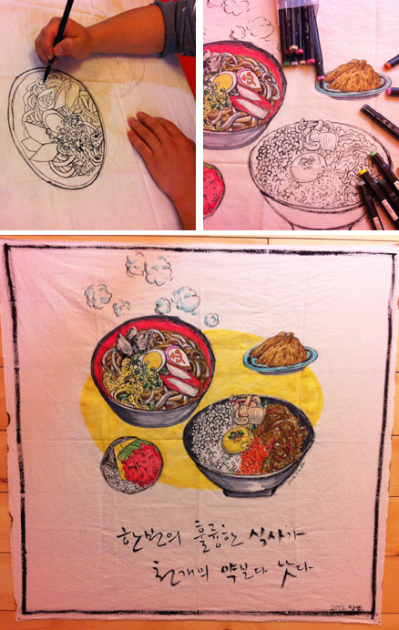 메뉴는 원래 사진을 넣은 현수막으로 두 장을 뽑아 앞뒤로 볼 수 있게 할려고 했는데, 인쇄용 일러스트 파일 만들기도 귀찮고 돈도 아낄 겸 천장에 쓰고 남은 천에 직접 쓰기로 생각을 바꾸었습니다. 글씨를 쓰는 것이 아니라 그리는 중. 저건 글씨가 아니라 그림입니다. ㅋㅋ 비용은 0원.
