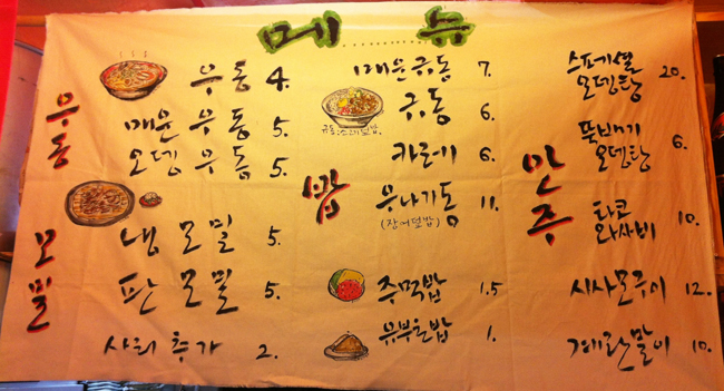 완성된 메뉴를 주방입구에 붙여 어디에서나 볼 수 있도록 했습니다. 간혹 글씨가 어지러워 알아보기 어렵다는 손님도 있습니다만, 대표메뉴도 간단히 그려넣었고 나름 만족입니다.