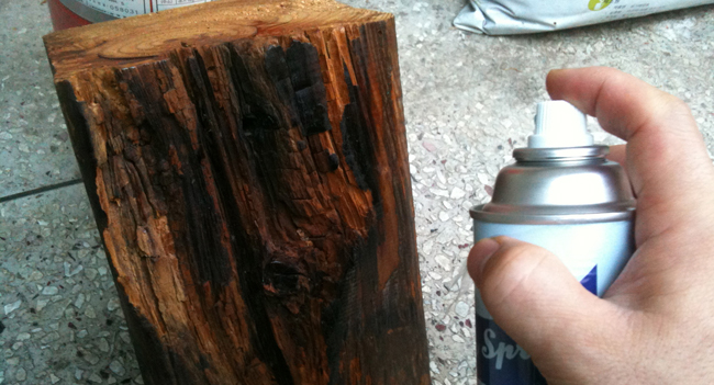 썩은 부분의 부스러기등이 떨어지지 않게 하기 위해 투명 락카를 뿌렸습니다. 냄새가 좀 나니 바깥에서 도포한 후 하룻밤은 지나야 합니다. 너무 가까이서 말고 좀 떨어져서 2-3번 반복해서 뿌려줍니다.