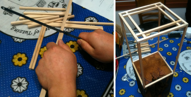 2. 한지등을 만들기 위해 뼈대를 만들고 있습니다. 화방에 가니 가는 나뭇대를 팔더라고요. 가격은 굵기에 따라 다르지만 가는 것은 몇 백 원정도입니다. 나무토막과 비슷한 크기로 만들기로 하고 크기를 재서 잘라줍니다. 간단한 구조인데도 생각보다 어렵네요. 일단 뼈대 완성!