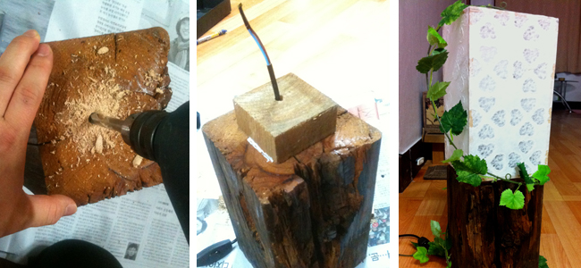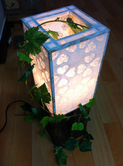 전구를 연결하고 미리 만들어놓은 한지등을 나무위에 고정시키면, 쨔쟌! 한지등 완성입니다. 짝짝짝!! 등만으로는 좀 밋밋한 것 같고 썩은 나무가 새 생명을 얻은 듯한 느낌을 주기위해 인조 나뭇잎덩굴도 감아보구요. 생활용품점에서 3천원에 구입.
