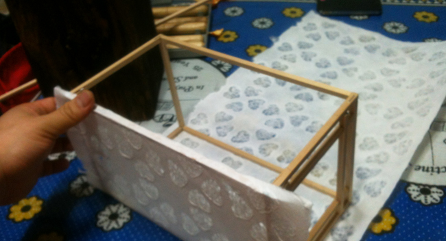 3. 화방에서 사온 예쁜 한지를 적당히 잘라 뼈대에 붙여줍니다. 뼈대에 목공접착용 본드를 발라 한지를 팽팽히 당겨가며 붙이면 됩니다. 예쁜 한지는 너무 얇으면 찢어지기 쉬우니 참고하시구요, 전 1장을 2,500원에 구입했습니다. 아래쪽은 나무에 고정해야하고 위쪽은 전등을 교체할 수도 있으니까 가운데 구멍은 막지 말아야지요.