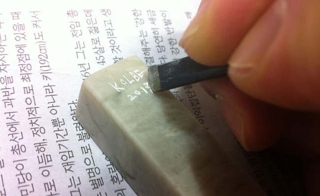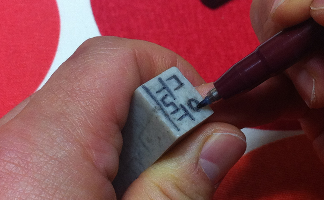 이렇게 저렇게 글씨 모양을 연습해보다가 직접 돌에 글씨를 거꾸로 써넣었습니다. 나무에 새길 땐 종이에 써서 거꾸로 붙인 다음 새겼는데 돌은 어떤지 몰라 그냥 직접 썼습니다. 바로 된 모양을 볼 수 없어 어떻게 나올지 걱정이지만 이름이야 알아 보겠지라는 마음으로 쭉쭉 진행합니다.