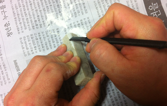 돌은 무른 옥돌이라 전각도로 깎아낼 수 있지만 그래도 역시 돌인지라 쉽지가 않네요. 조그만 곳에 오밀조밀한 글씨를 한 참 새겨넣다 보니 눈도 아프고 손가락도 쑤시네요. 수녀원가서 잘 살아라 기도하며 다시 손에 힘을 줍니다.