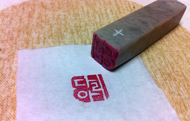 그럼 완성된 도장을 찍어볼까요? 어떠세요? 잘 쓴 글씨는 아니지만 그래도 직접 새긴 것이니만큼 꽤 운치 있네요. 본인이 소장하고 있는 책의 책도장으로 쓰셔도 좋고, 엽서나 편지 등을 쓸 때 마지막 이름 옆에 찍으면 아주 멋있겠지요? 물론 통장도장으로도 오케이! 이래저래 쓰임새가 아주 많은 녀석입니다.