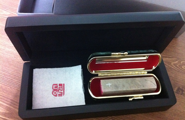 선물에 예쁜 포장은 필수! 저런 케이스는 어디서 사냐구요? 노노! 모두 재활용입니다. 식당에서 일하는데 어떤 손님이 행사기념품으로 좋은 볼펜을 받으셨는데 볼펜만 쏙 빼고 케이스는 버리시더라고요. 나중에 누구 선물할 때 케이스로 쓰면 좋겠다 싶어 슬쩍 주워놨지요. 너무 궁상맞나요? 그래도 저는 좋습니다. 저렇게 맞춘 듯이 선물을 담아 줄 수만 있다면야! 평소에 저런 큰 케이스를 가지고 다닐 수는 없을 테니 제가 안 쓰는 도장 지갑도 보너스 선물로 넣었습니다. 주변에 그런 케이스를 버리시는 분이 안 계시다구요? 걱정 마세요. 필방에 가면 5천 원 정도에 전용케이스를 팝니다.