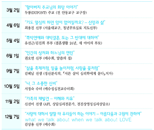 4월 최용진 신부(서울대교구), 5월 유선근 · 김진희 부부, 6월 권오면 신부(예수회), 9월 김혜남 정신분석의, 10월 서정숙 수녀(예수성심전교수녀회), 11월 상담심리전문가 신선미 씨(AFI 회원), 12월 김상용 신부(예수회)의 강의가 예정돼 있다. (문의 : 02-3276-7706, magistalk@gmail.com)